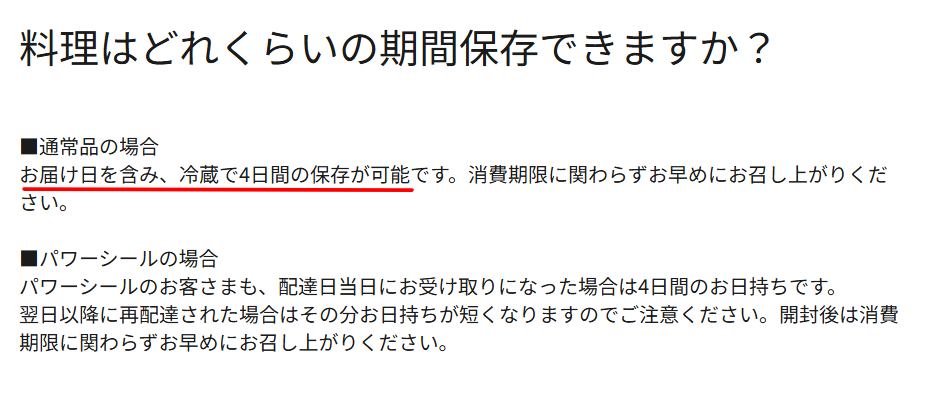 結論を先に言うと、つくりおき.jpの賞味期限は配達日を含めて冷蔵で4日間です。